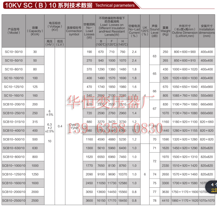 品牌:SCB10-200KVA 型号:10kV级SCB9、SCB10系列干式变压器 额定电压:11(kV) 额定容量:160(KVA) 负载耗损:2.140(W) 阻抗电压:4.0(%) 尺寸:1040*710*1000(m) 产
